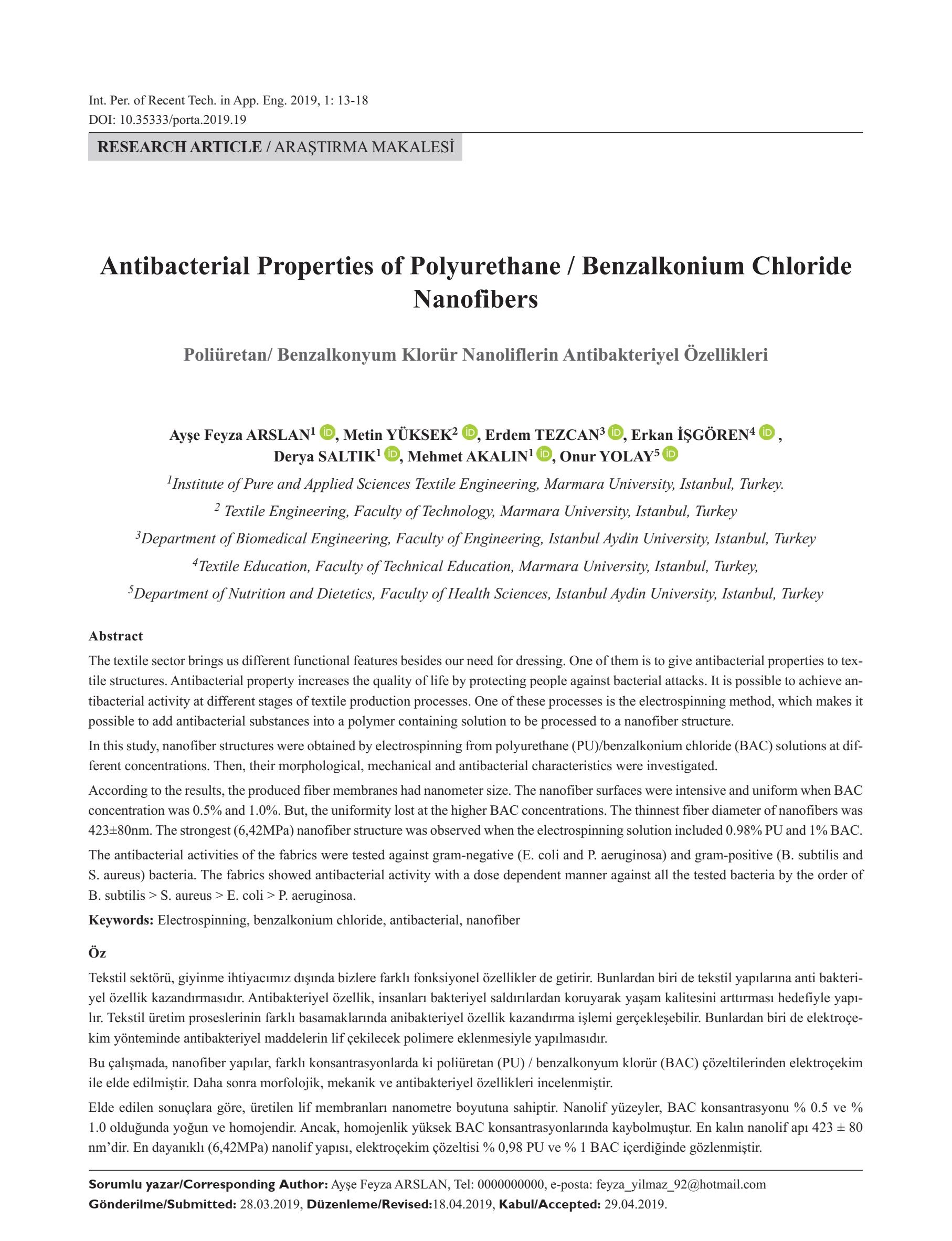 Bu çalışmada, farklı konsantrasyonlarda poliüretan (PU)/benzalkonyum klorür (BAC) çözeltilerinden elektroeğirme ile nano lif yapıları elde edilmiştir. Daha sonra morfolojik, mekanik ve antibakteriyel özellikleri incelenmiştir.